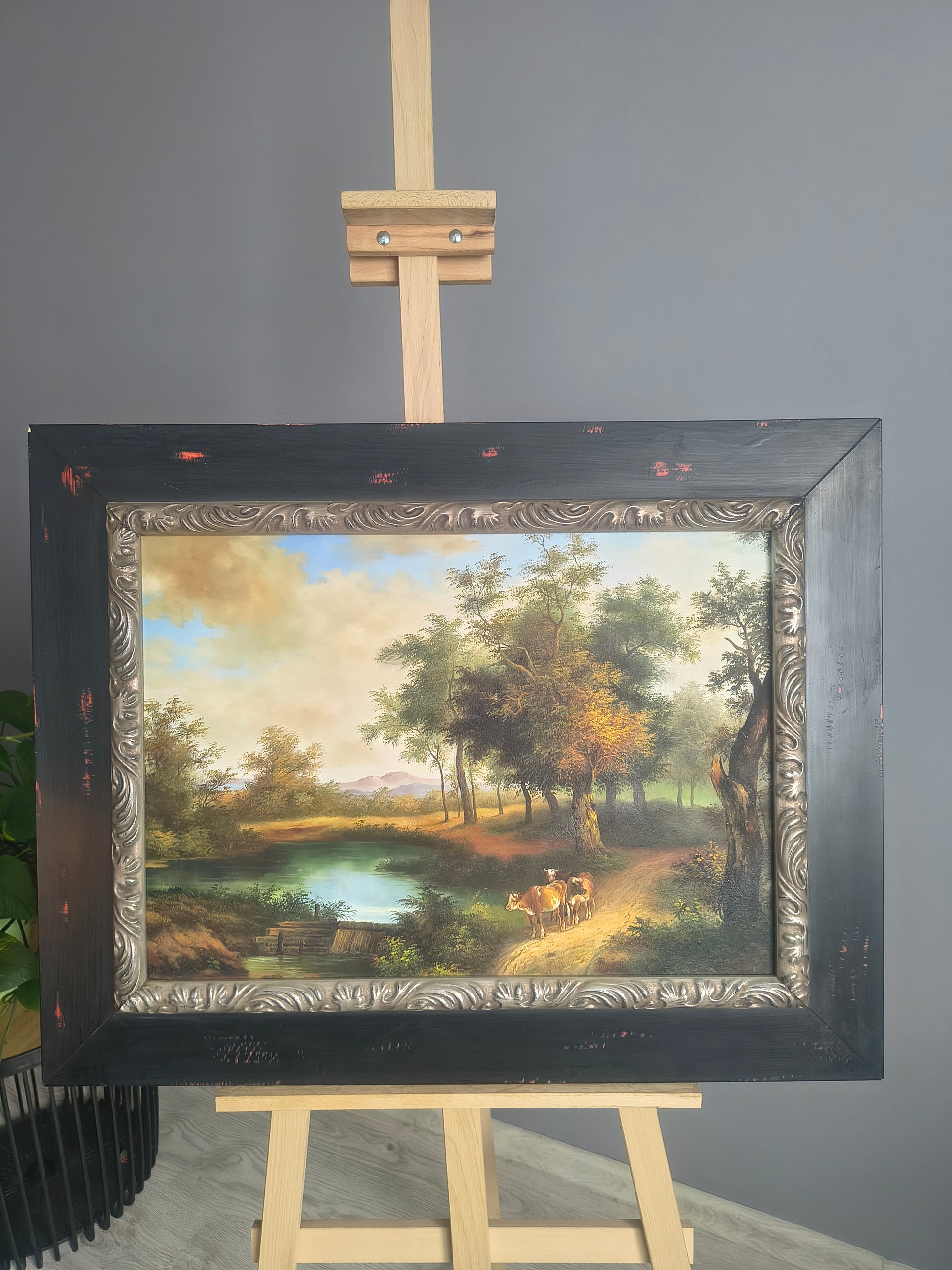 Eine bezaubernde, klassische Landschaftsdarstellung zeigt einen ruhigen, von Bäumen umgebenen See mit zwei grasenden Kühen auf einem Waldweg. Die warme Farbpalette, das sanfte Licht und die natürliche Atmosphäre schaffen eine harmonische, idyllische Szene im traditionellen Malstil. Ideal für Wohnzimmer, Büros, Esszimmer sowie für rustikale und klassische Interieurs.