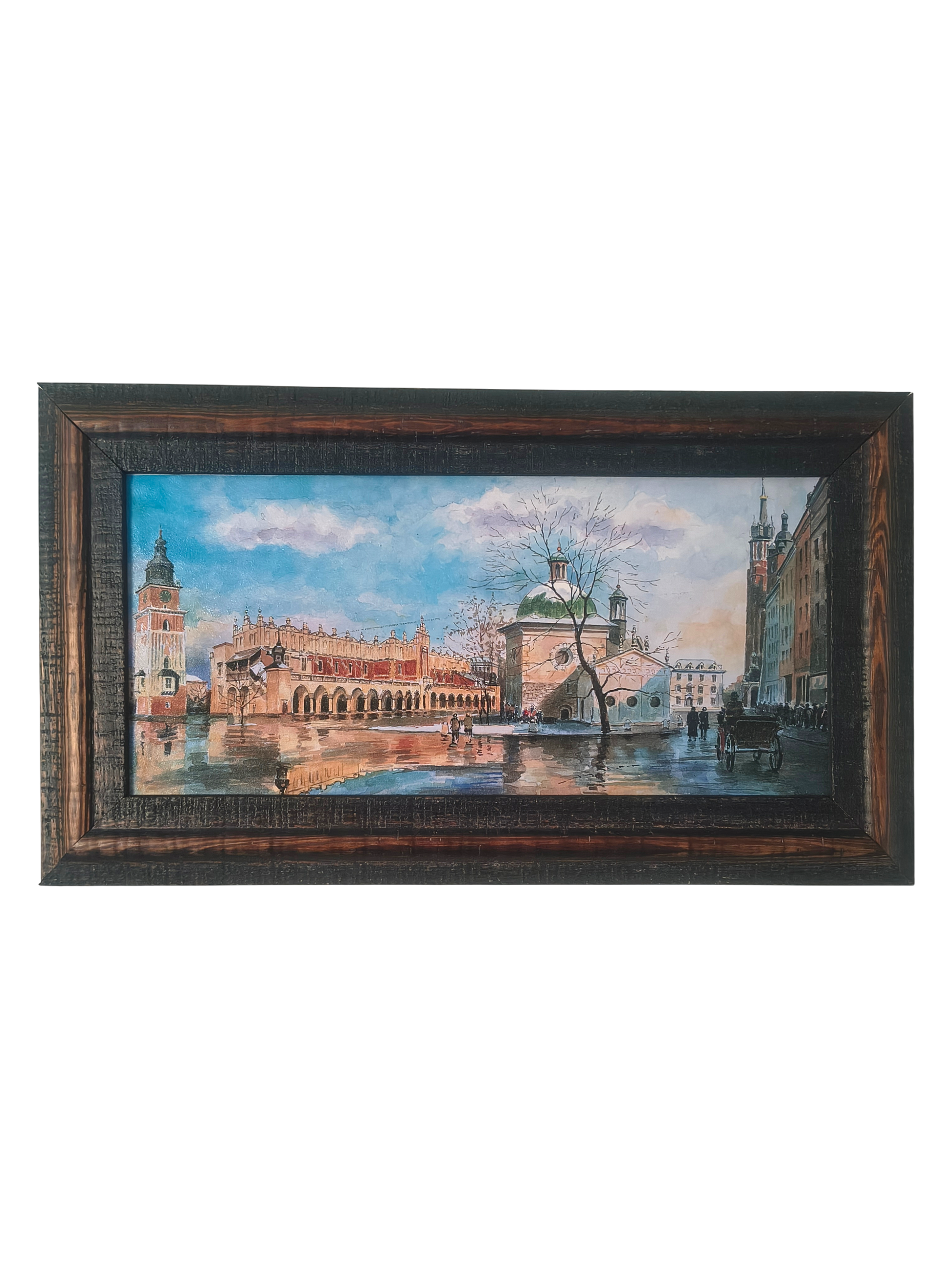 Eine elegante Reproduktion, die eines der bekanntesten Motive Krakaus zeigt: den Hauptmarkt mit den Tuchhallen, der St.-Adalbert-Kirche und der charakteristischen Stadtarchitektur. Diese stimmungsvolle, detailreiche Szene fängt die Atmosphäre der Altstadt ein, während die Spiegelungen auf dem nassen Kopfsteinpflaster Tiefe und einen malerischen Charakter verleihen.