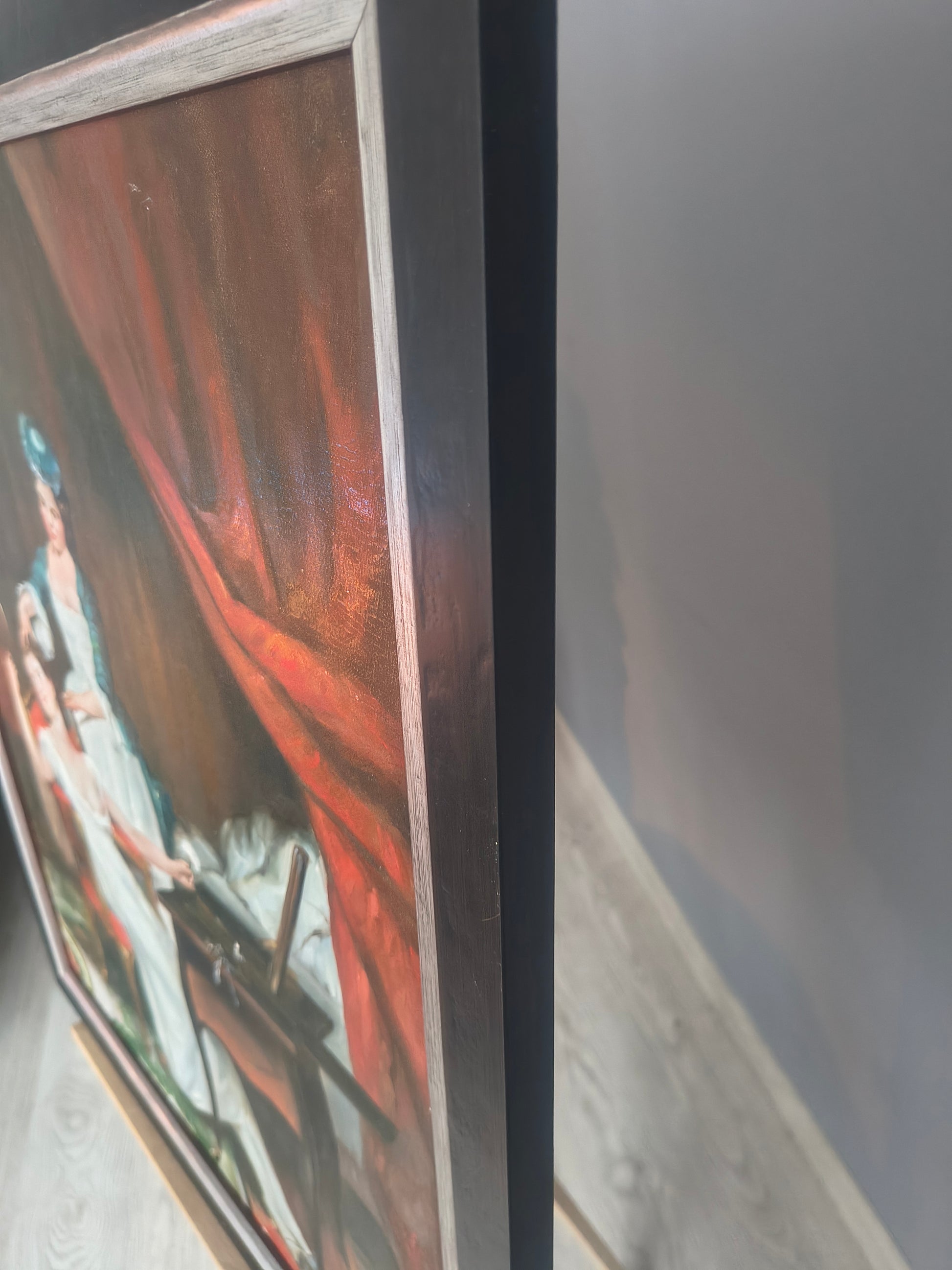 Eine elegante, stilisierte Interieurszene zeigt Damen bei ihren Vorbereitungen – ein typisches Motiv der Salonmalerei des 19. Jahrhunderts. Prächtige Draperien, klassische Möbel und fein gezeichnete Figuren schaffen eine Atmosphäre von Luxus und Nostalgie. Dieses Gemälde passt hervorragend in Wohnzimmer, Büros und sowohl klassische als auch glamouröse Räume und verleiht jedem Interieur eine raffinierte Note.