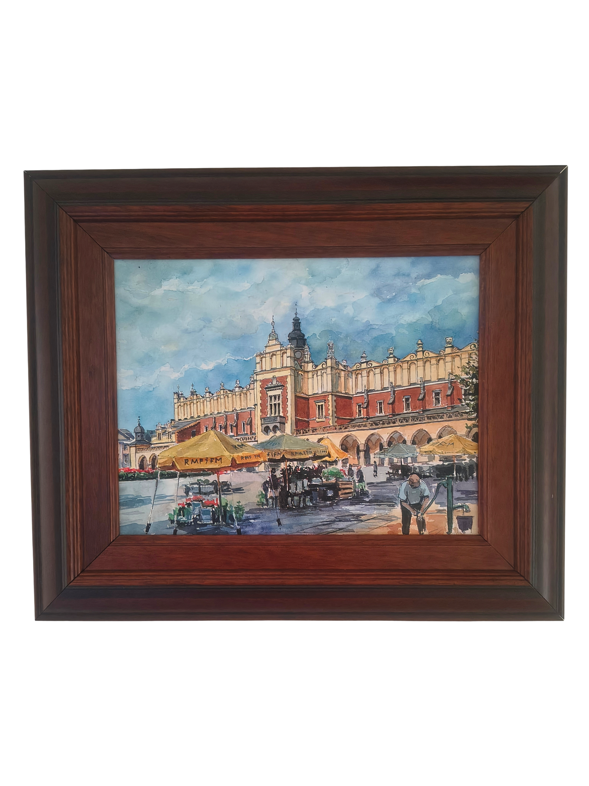 Eine stilvolle Aquarellreproduktion der Tuchhallen am Krakauer Hauptmarkt. Helle Linien, leuchtende Farben und subtile Schattierungen schaffen eine angenehme, urbane Landschaft mit klassischem Charakter. Ideal als Dekoration für Wohnzimmer, Büro oder Flur oder als elegantes Geschenk für Krakau-Liebhaber.