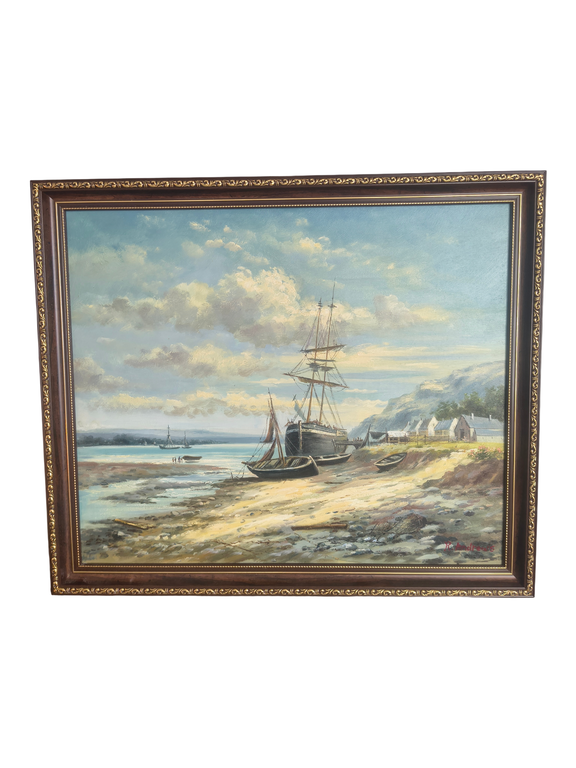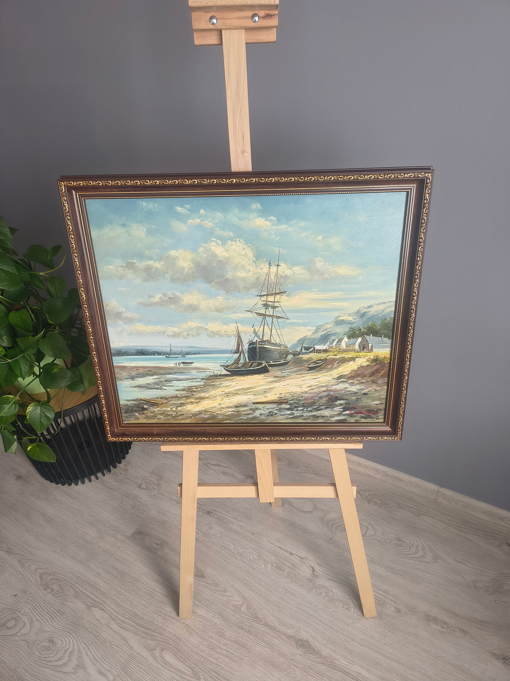 Eine einzigartige maritime Landschaft mit vor Anker liegenden Segelbooten bei Ebbe, die eine ruhige Bucht und Küstengebäude überblicken. Warmes Licht, detailreiche Pinselstriche und eine reiche Perspektive verleihen dem Gemälde Ruhe und klassische Eleganz. Ideal für Wohnzimmer, Arbeitszimmer oder Interieurs im Kolonial-, Vintage- und traditionellen Stil.