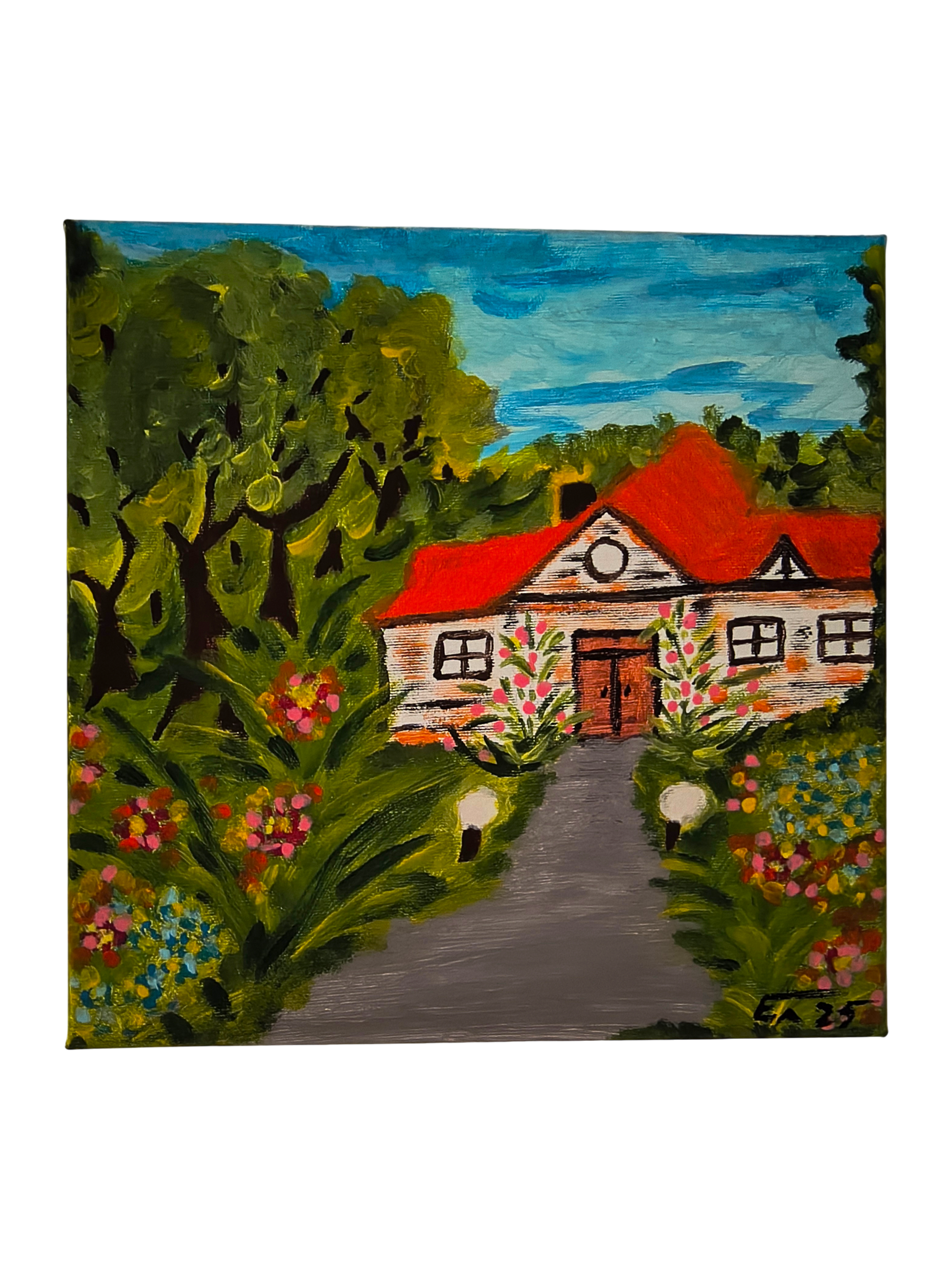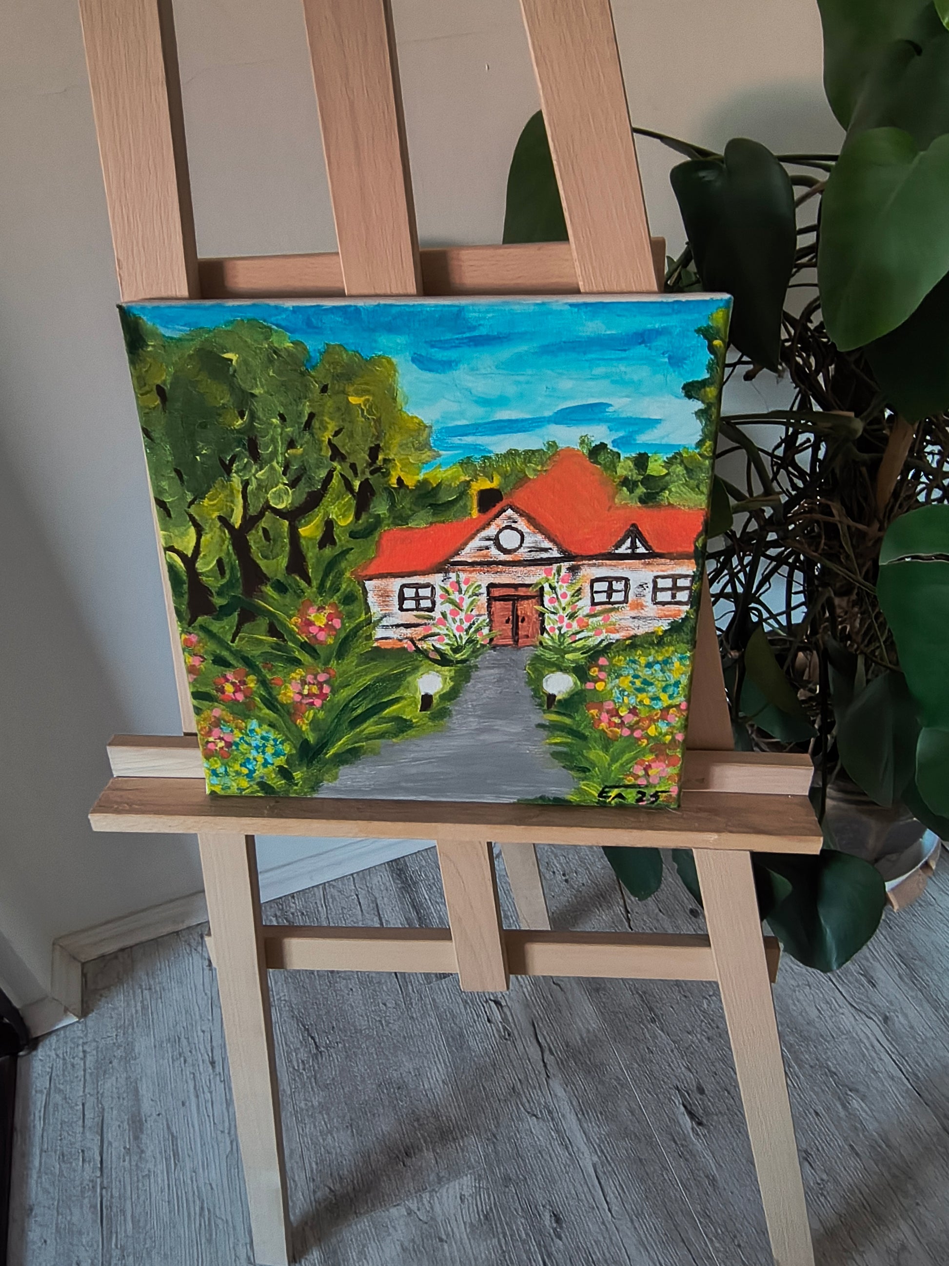 Dom w Ogrodzie – Ręcznie Malowany Pejzaż Akrylowy