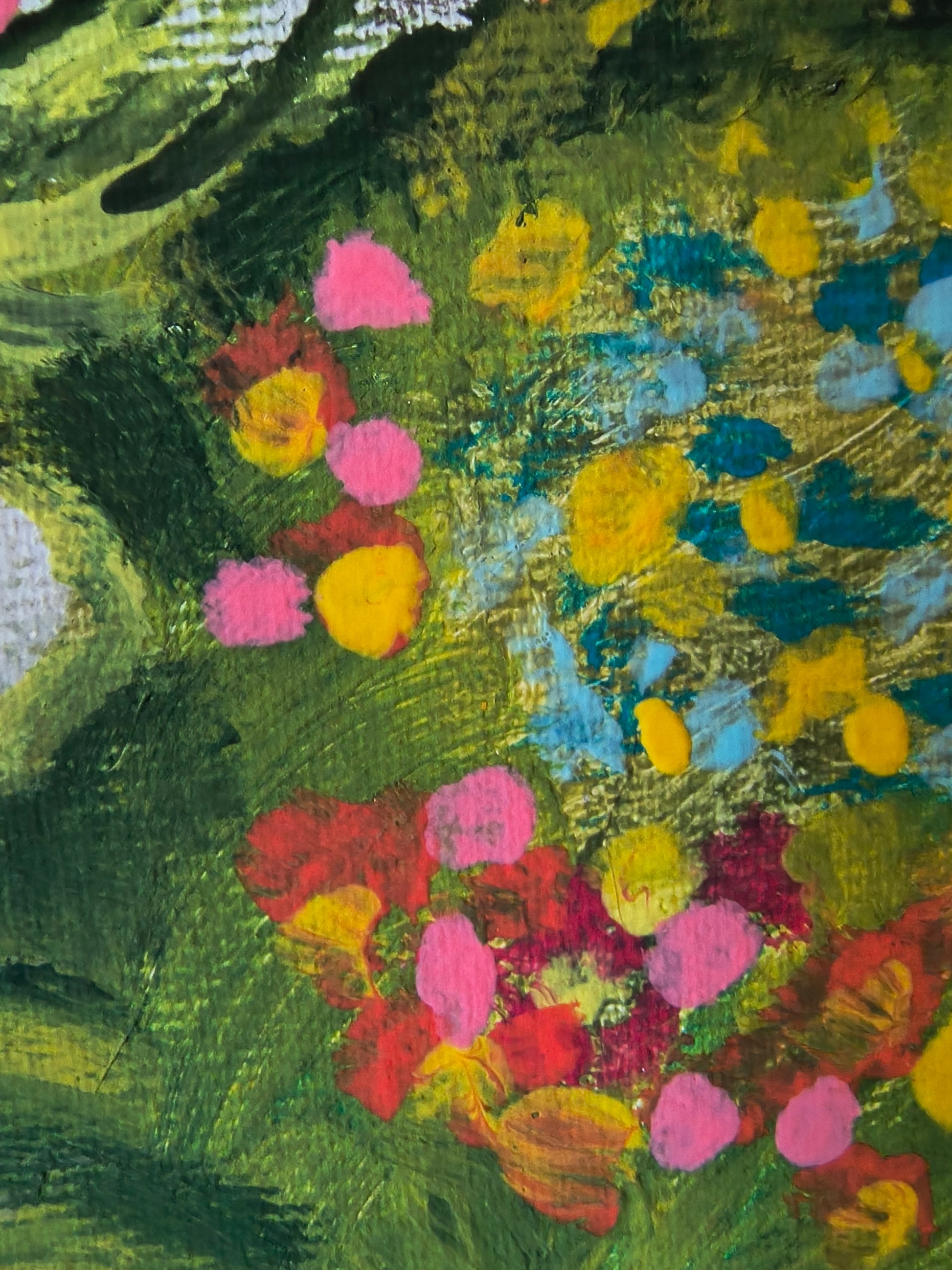 Barwny, radosny pejzaż przedstawiający niewielki dom z czerwonym dachem otoczony bujną zielenią i kwiatami. Obraz utrzymany w stylistyce malarstwa naiwnego – proste formy, mocne kolory i dekoracyjny charakter nadają scenie wyjątkowego, nieco bajkowego klimatu. Idealny do kuchni, salonu, pokoju dziecięcego lub wnętrz w stylu folk, cottagecore i rustykalnym.