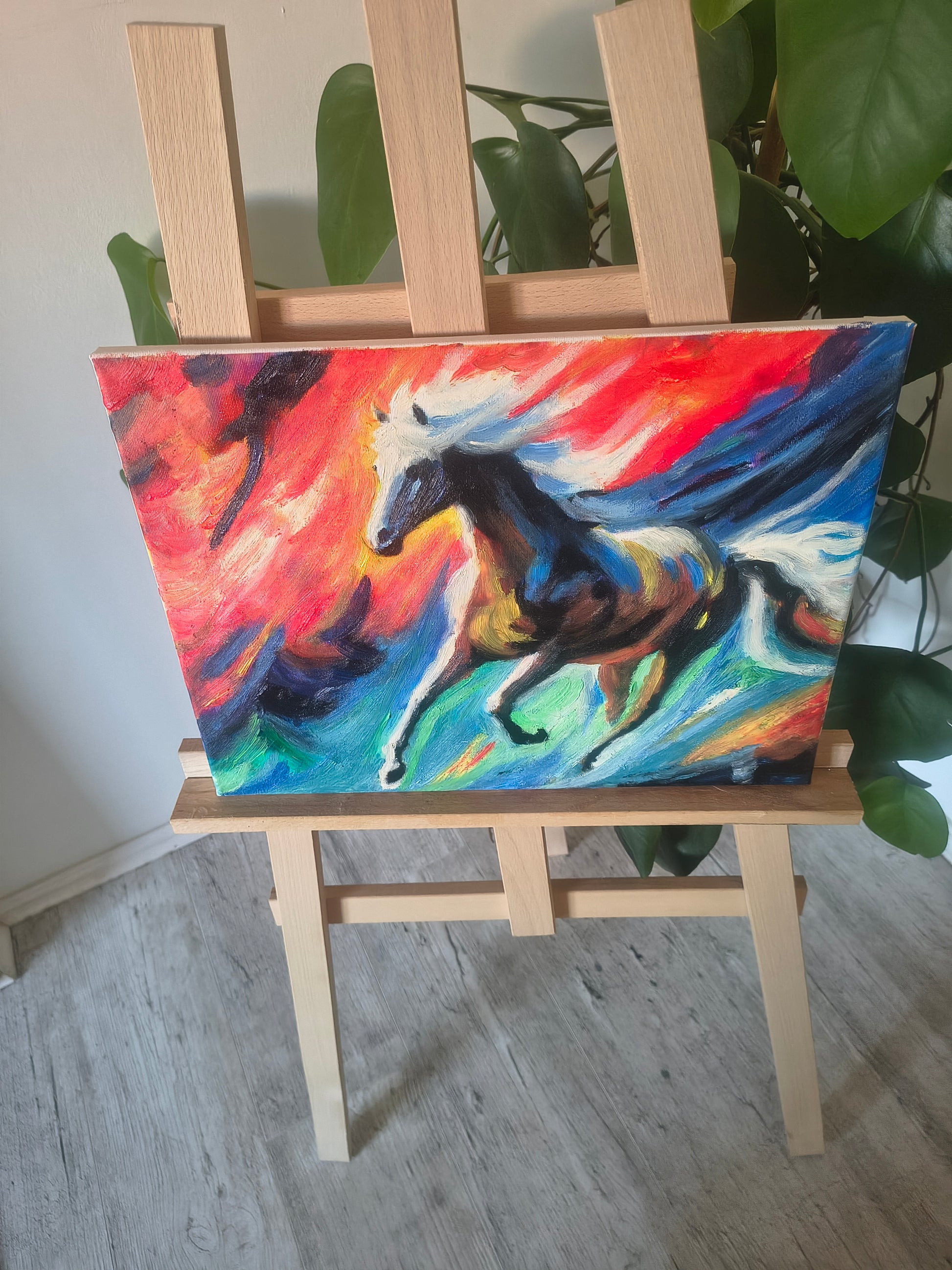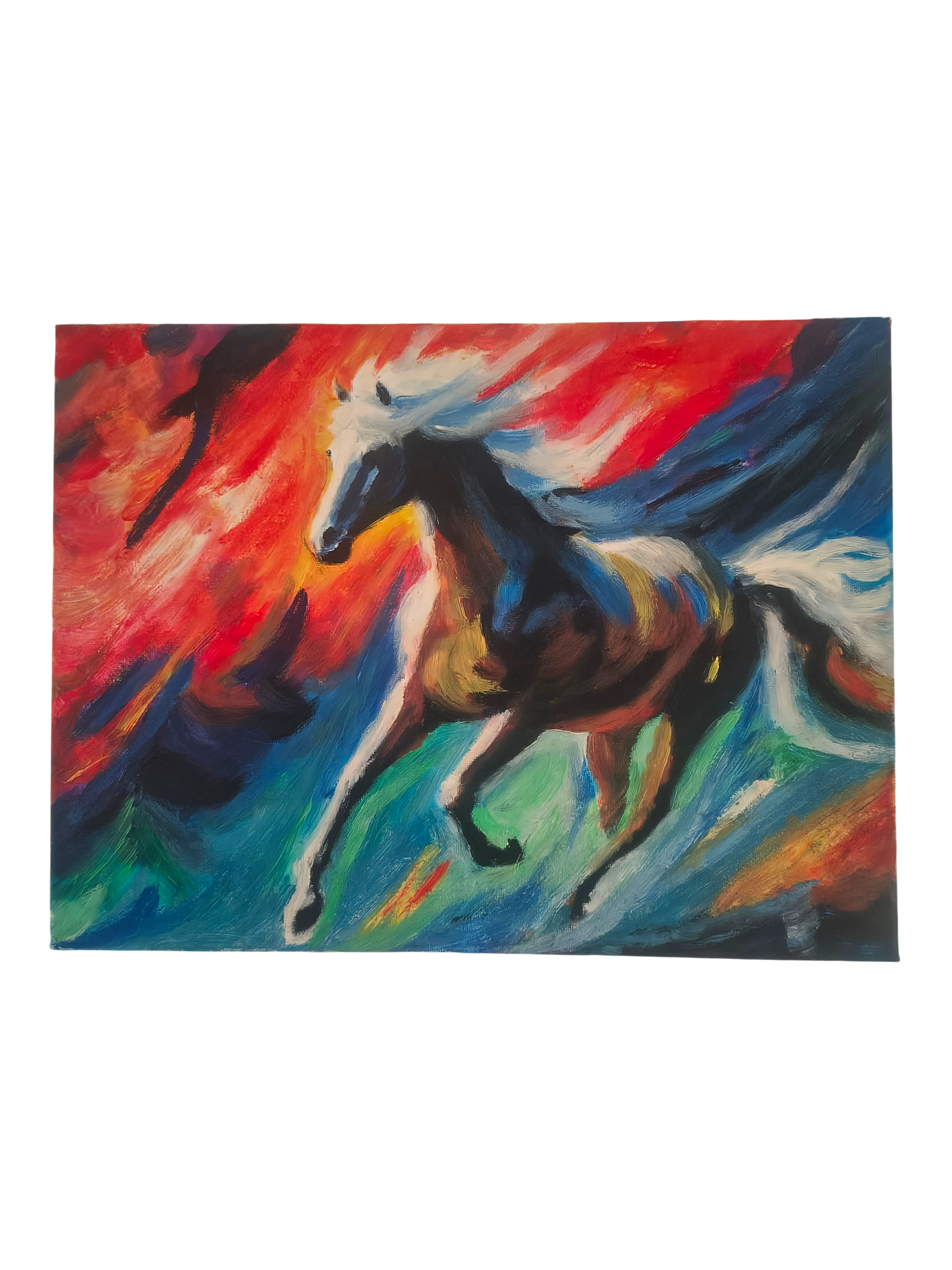 Wyrazisty, pełen energii obraz przedstawiający galopującego konia uchwyconego w ruchu. Intensywne czerwienie, błękity i kontrastowe pociągnięcia pędzla tworzą potężny efekt ekspresji i żywiołowości. Idealny dla miłośników koni, mocnych kolorów i sztuki, która przyciąga uwagę już od progu.