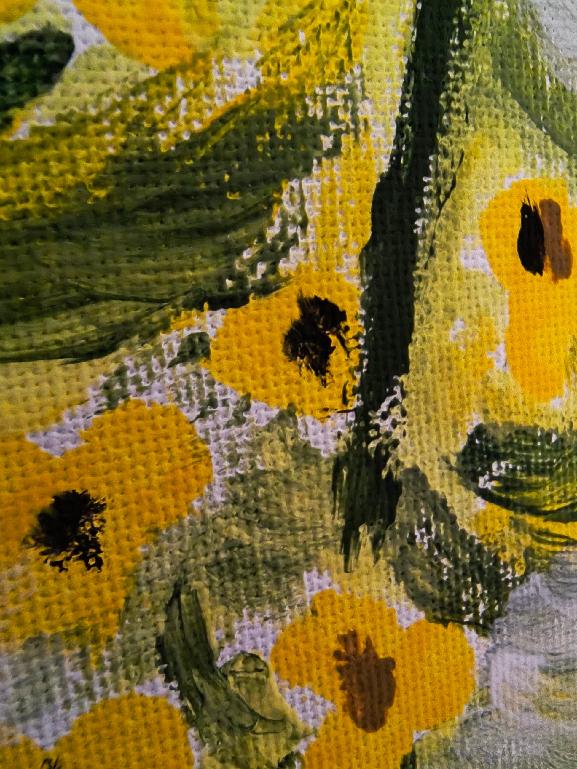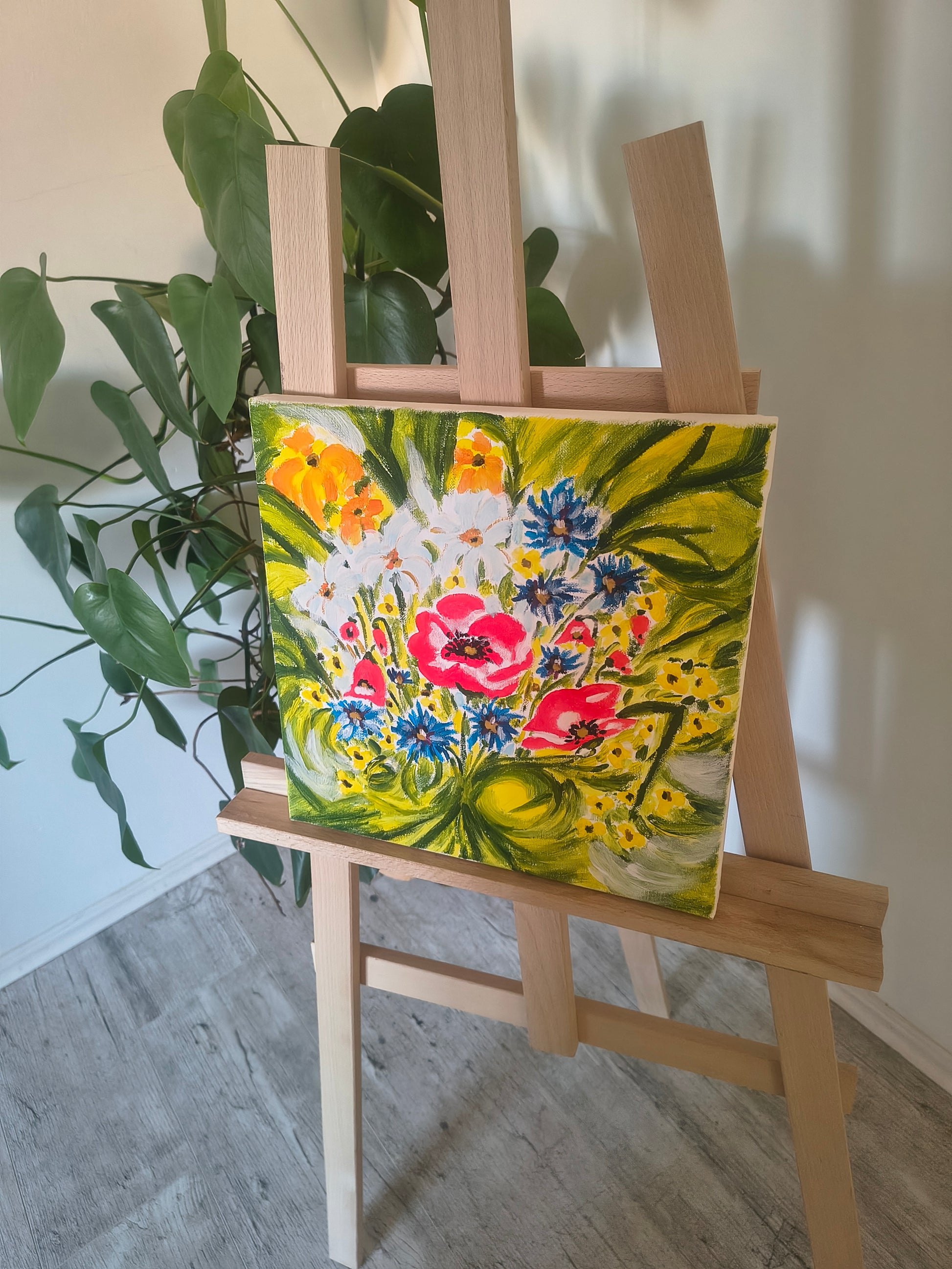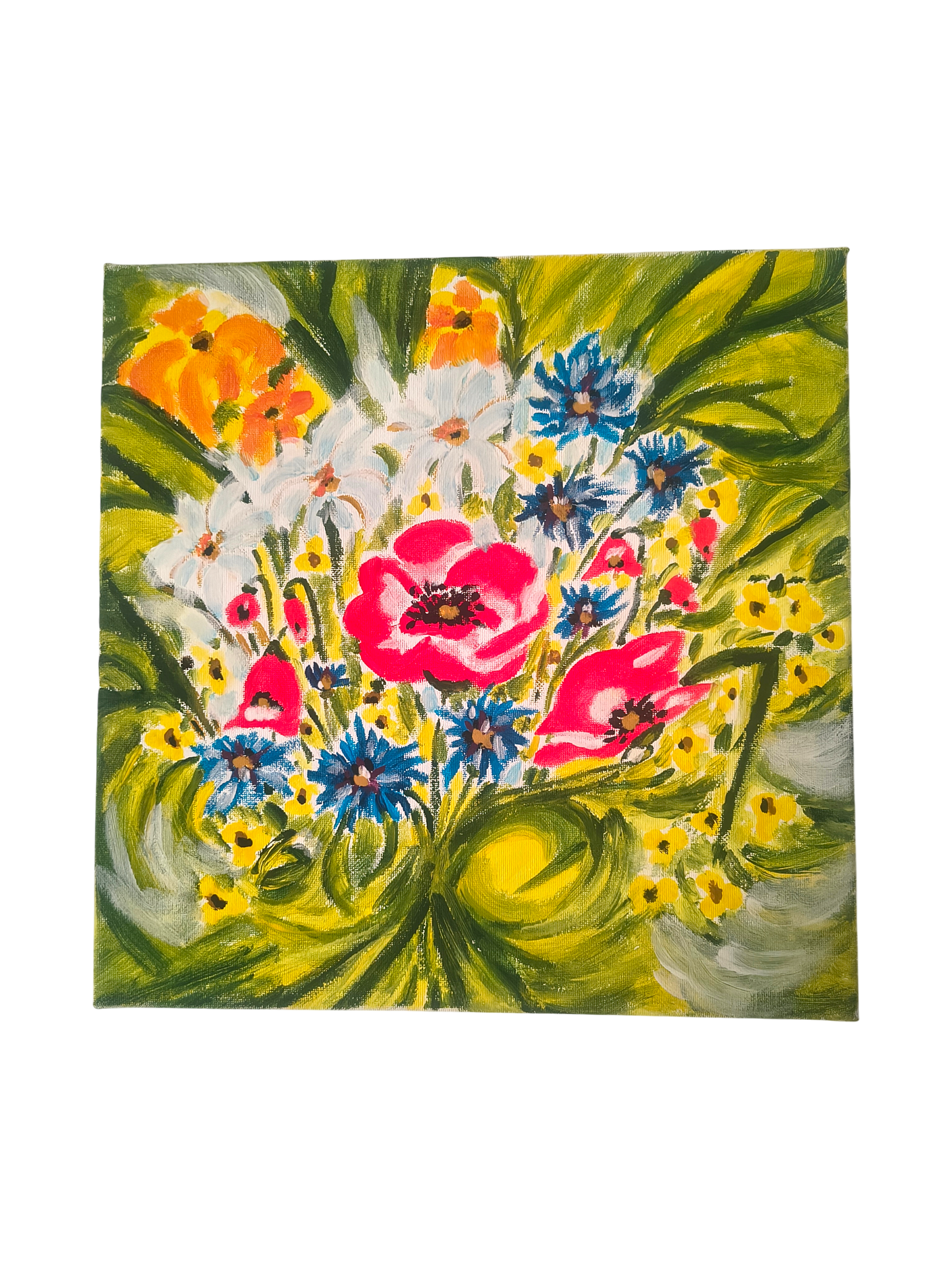Pełna energii, ręcznie malowana kompozycja kwiatowa utrzymana w żywych odcieniach żółci, zieleni, błękitu i różu. Swobodne, ekspresyjne pociągnięcia pędzla tworzą wrażenie ruchu i światła, dzięki czemu obraz natychmiast ożywia przestrzeń. To radosny, pozytywny akcent, który świetnie sprawdzi się w salonie, kuchni, przedpokoju lub domowym biurze.