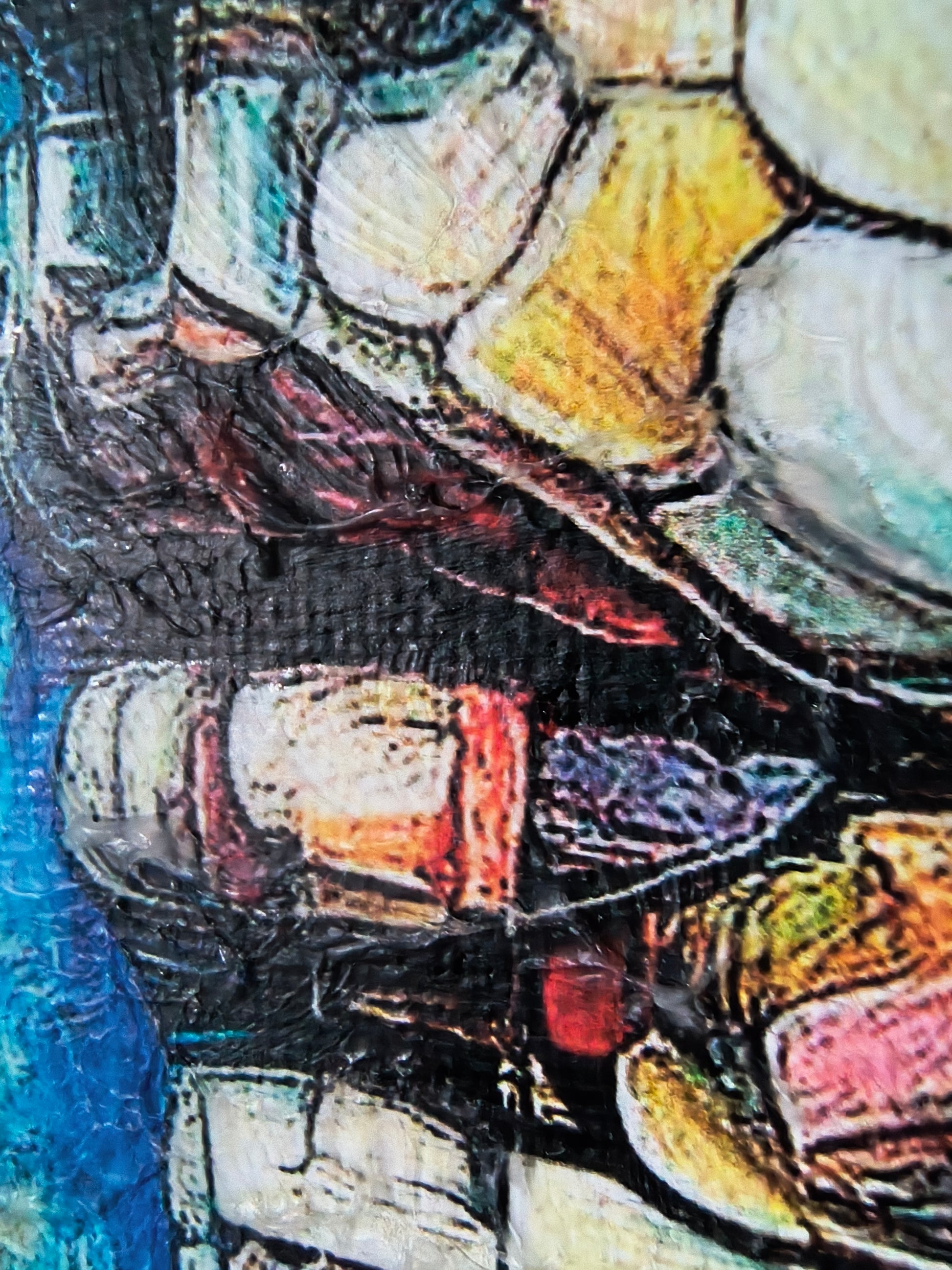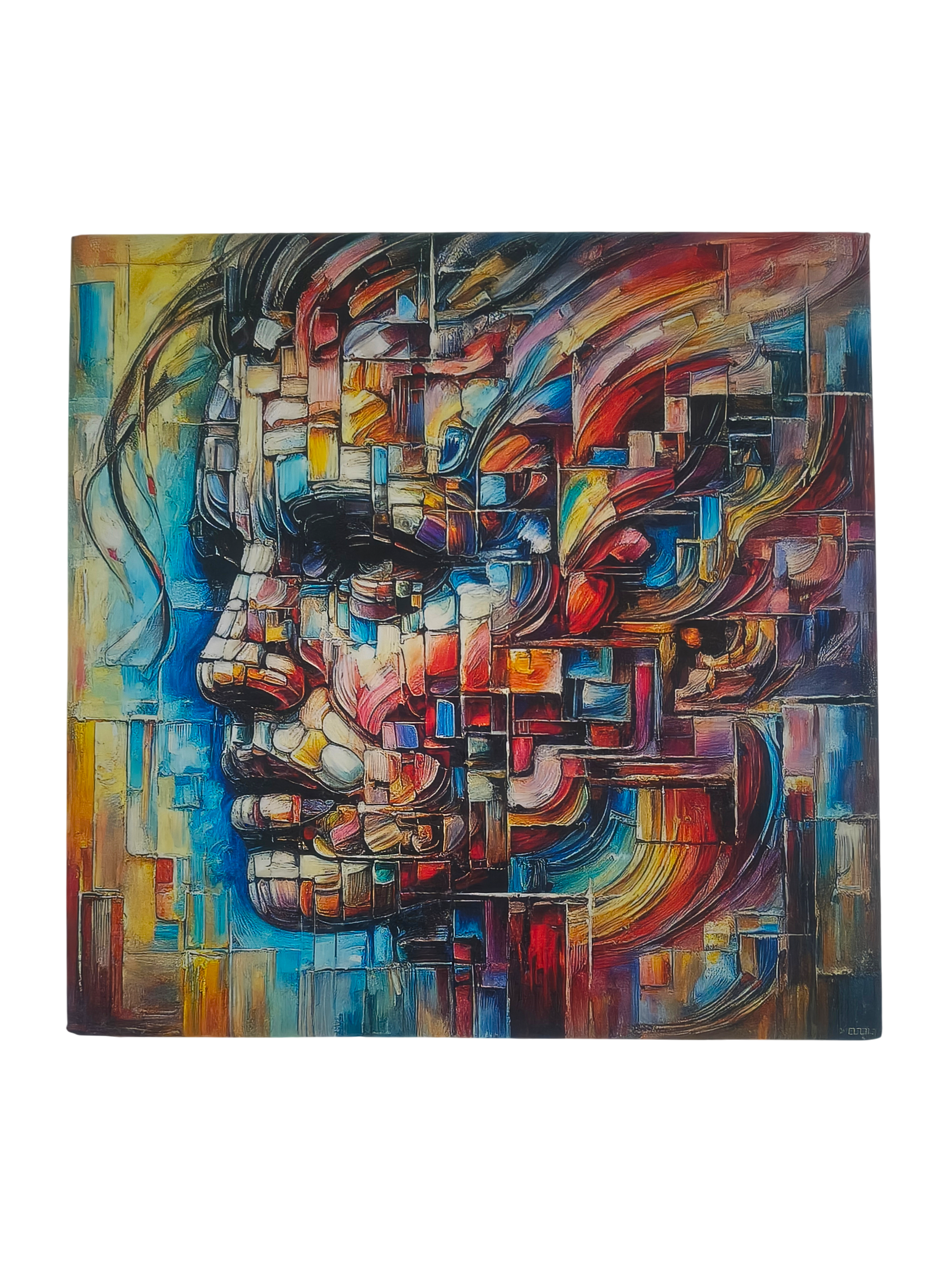 Wyrazisty, pełen energii portret zbudowany z geometrycznych form, pociągnięć pędzla i kontrastowych barw. Dynamiczna kompozycja przypomina szkło witrażowe lub mozaikę – twarz ukazana jest jednocześnie realistycznie i abstrakcyjnie. Intensywne odcienie czerwieni, błękitu, złota i turkusu tworzą efekt głębi oraz mocny, artystyczny klimat.