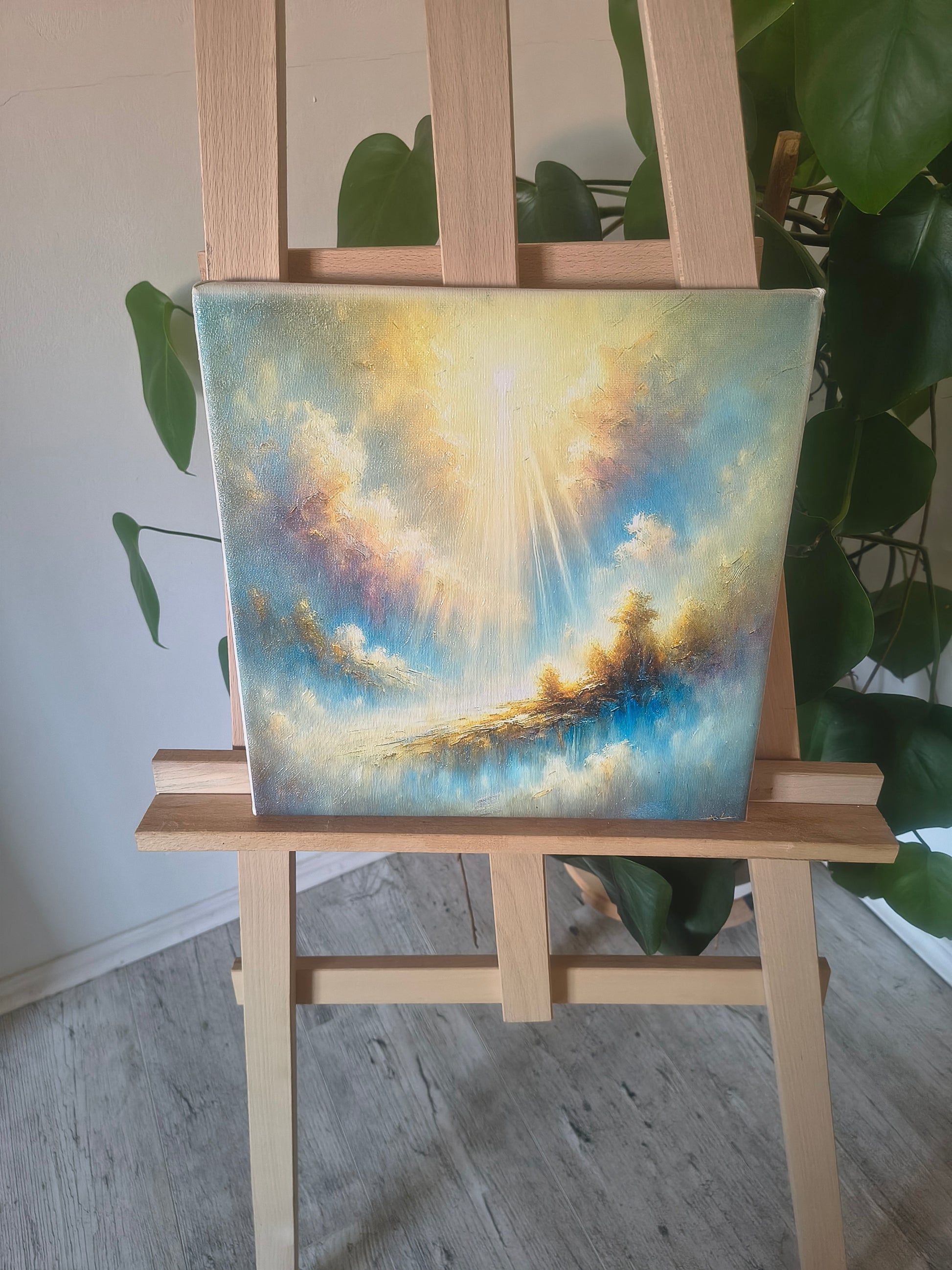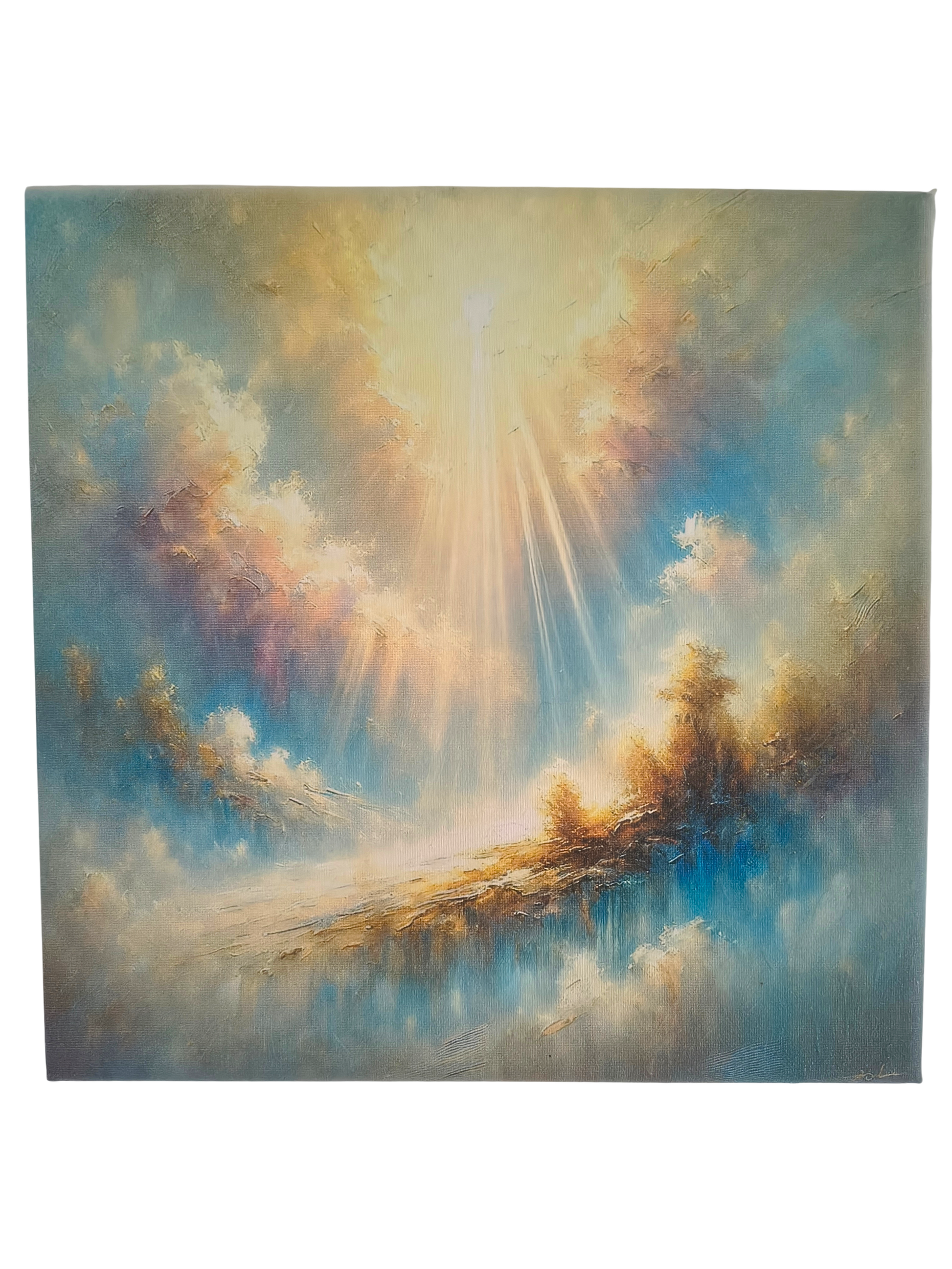 Nastrojowy, pełen blasku obraz przedstawiający rozświetlone niebo, przez które przebijają się złote promienie słońca. Delikatne chmury, miękkie przejścia kolorów oraz lekko abstrakcyjna forma tworzą niezwykle uspokajającą, wręcz duchową kompozycję. Idealny do sypialni, salonu, gabinetu lub przestrzeni, w których zależy nam na atmosferze harmonii i wyciszenia.