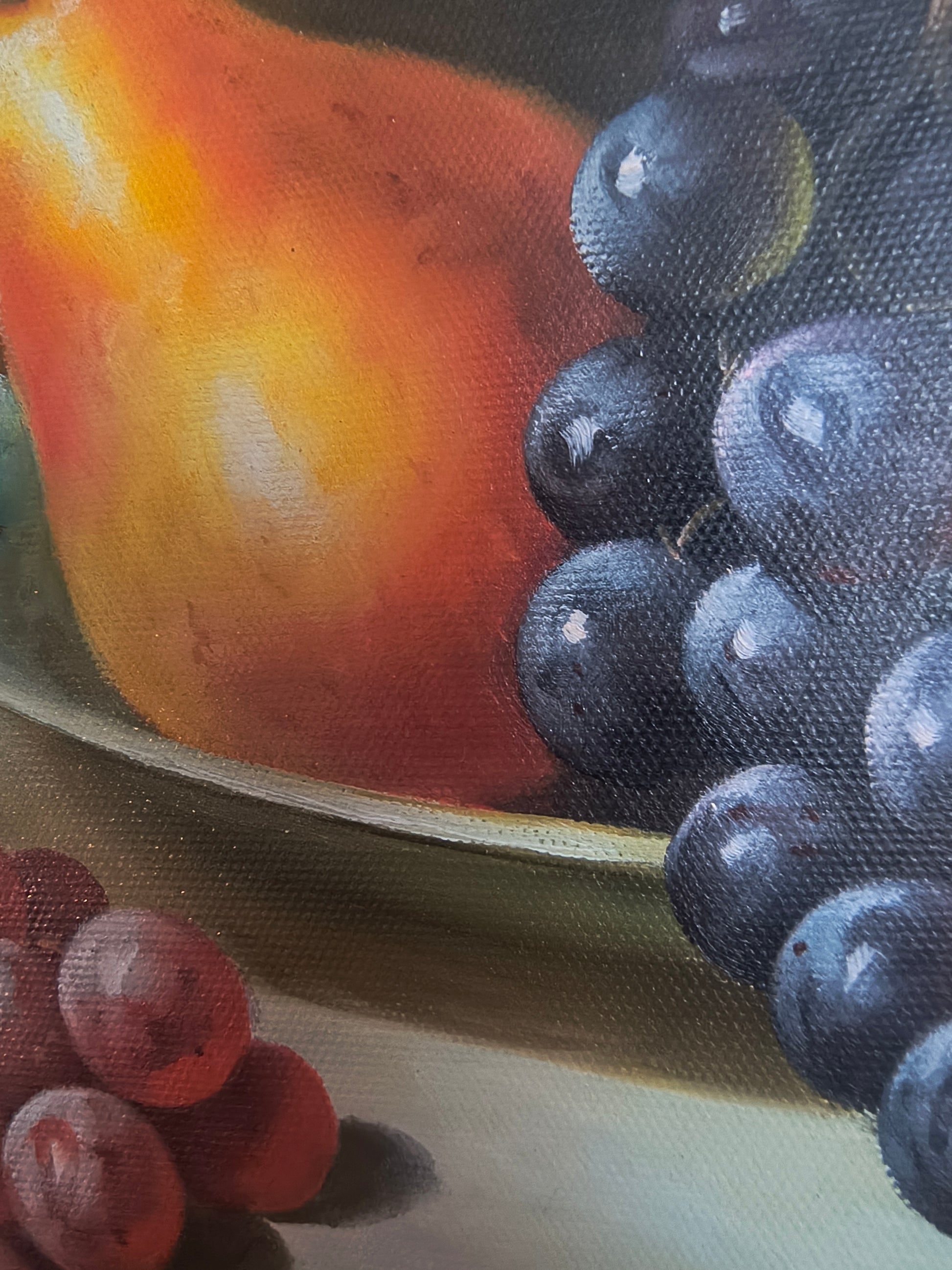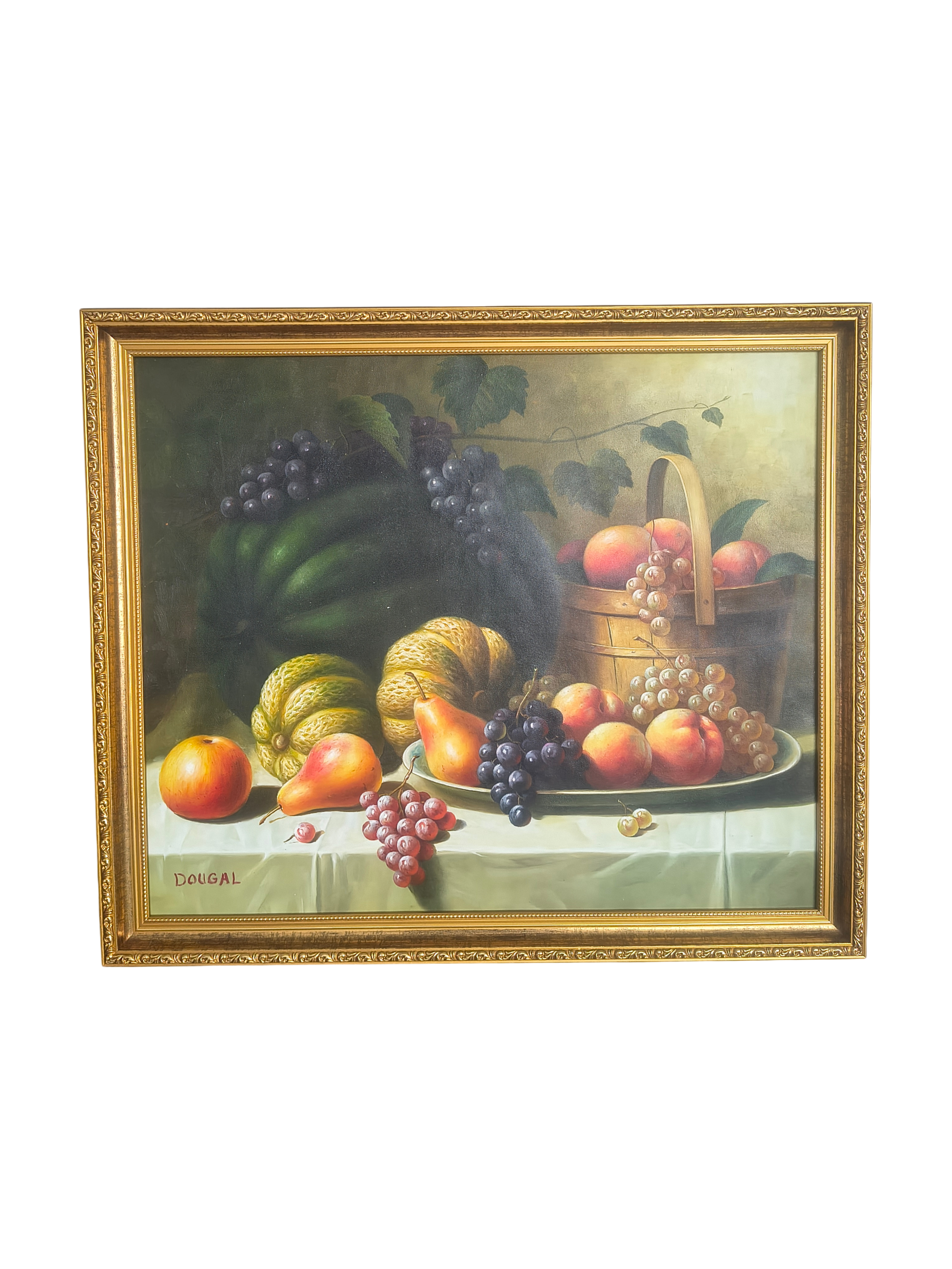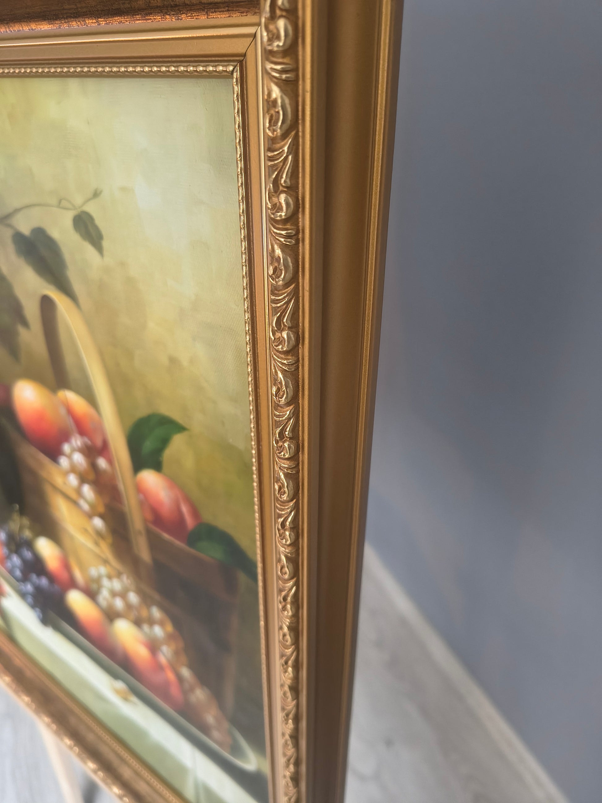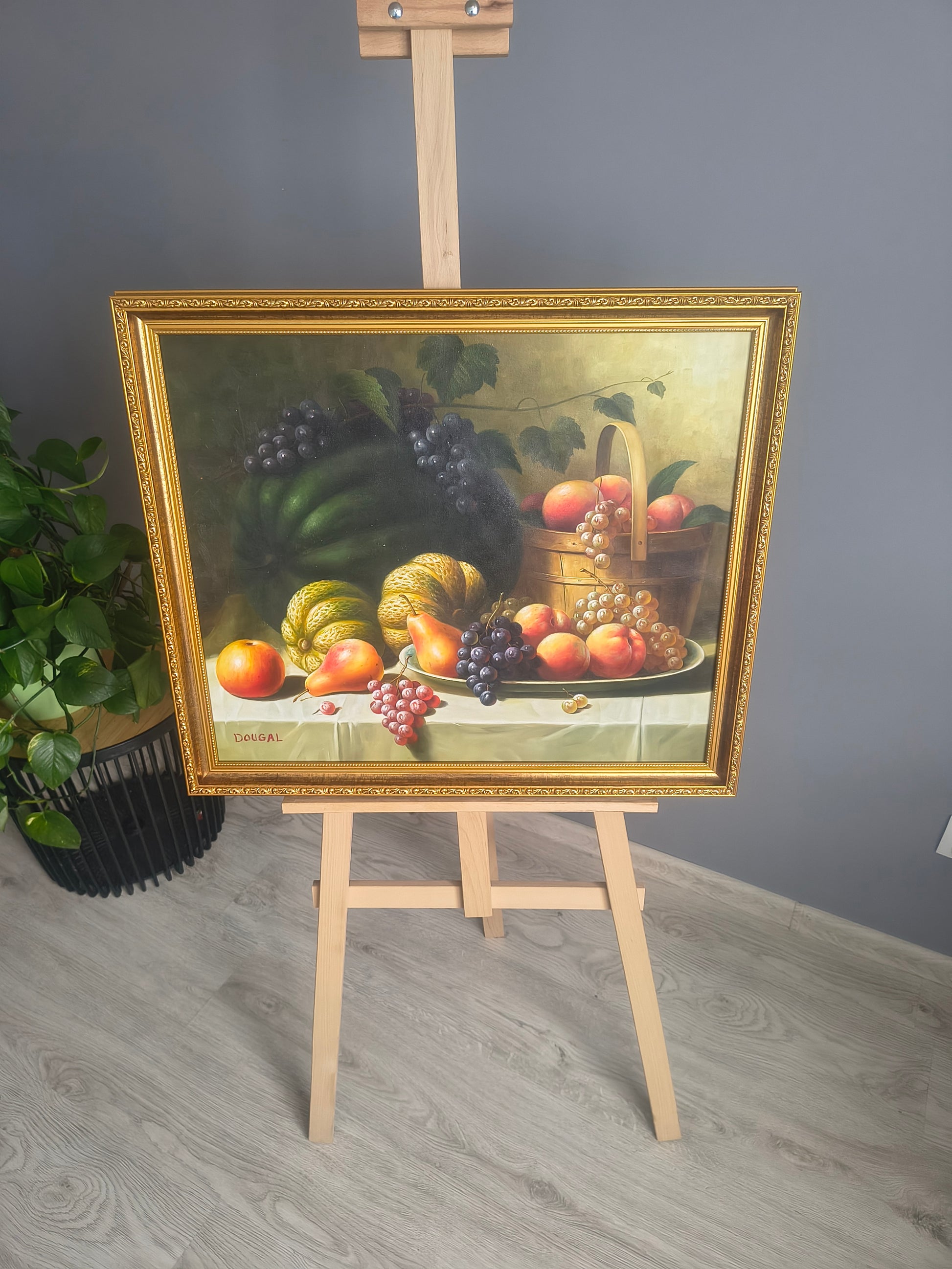 Klasyczna martwa natura przedstawiająca kompozycję dojrzałych owoców: winogron, gruszek, jabłek oraz melonów, ułożonych na stole z jasnym obrusem. Ciepła kolorystyka, piękne światło i elegancka, złota rama tworzą ponadczasowy akcent dekoracyjny. Idealny do jadalni, salonu lub wnętrz w stylu tradycyjnym i klasycznym.