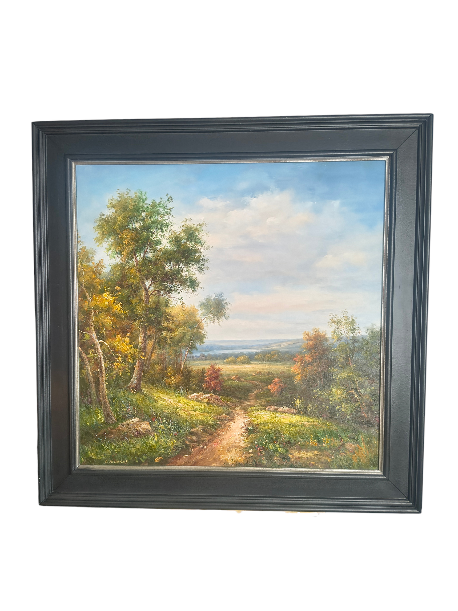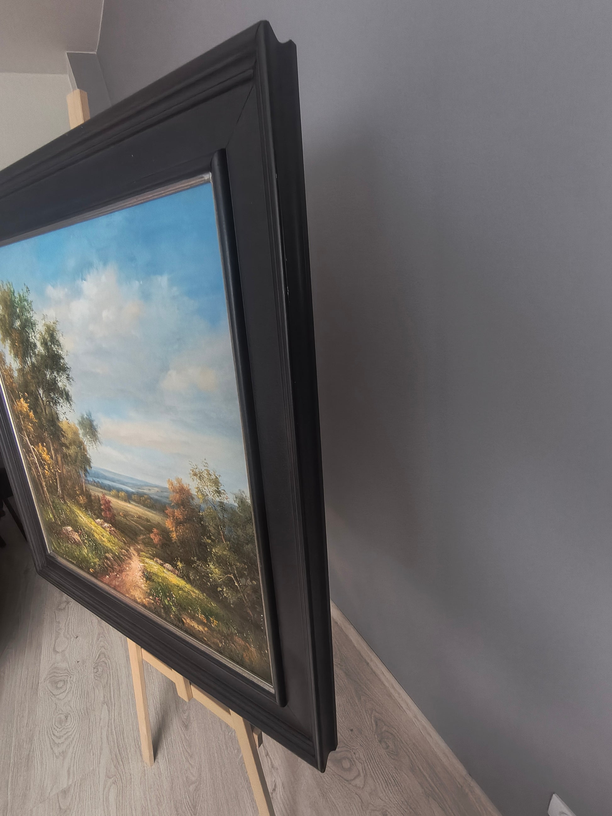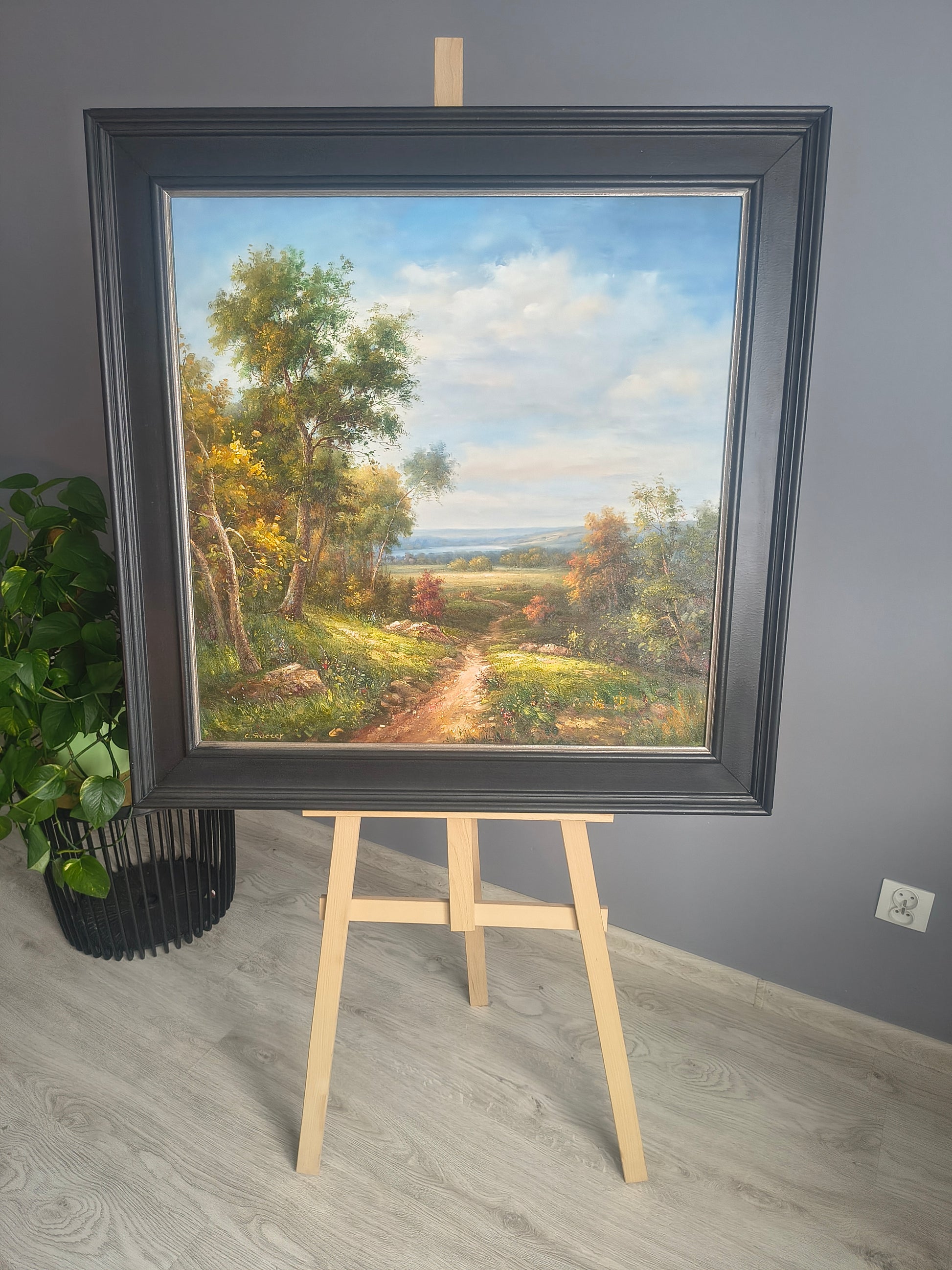 Nastrojowy, ręcznie malowany pejzaż przedstawiający wiejską ścieżkę prowadzącą przez słoneczne łąki i drzewa w pełni lata. Ciepłe barwy i świetlista kompozycja nadają wnętrzu spokoju i naturalnej harmonii. Idealny do salonu, jadalni lub gabinetu — szczególnie w aranżacjach klasycznych, rustykalnych i farmhouse.