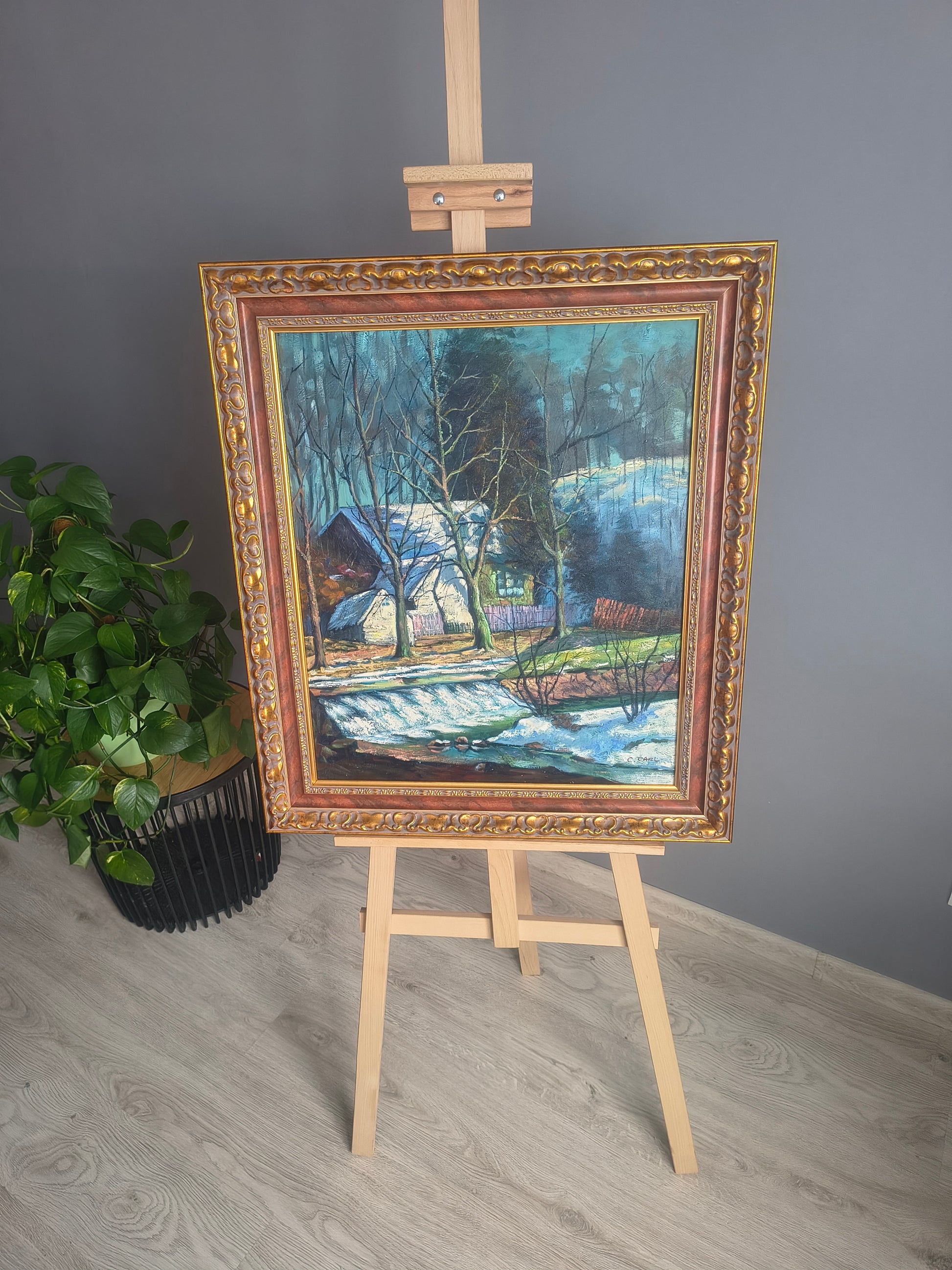 Wyrazisty zimowy pejzaż przedstawiający chatę pokrytą śniegiem, otoczoną nagimi drzewami i dynamicznie malowanym wodospadem w pierwszym planie. Intensywne błękity, kontrastowe cienie i charakterystyczne ekspresyjne pociągnięcia pędzla nadają obrazowi mocnego, artystycznego charakteru. Idealny wybór do wnętrz nowoczesnych, artystycznych i rustykalnych, jako dekoracja przyciągająca wzrok.